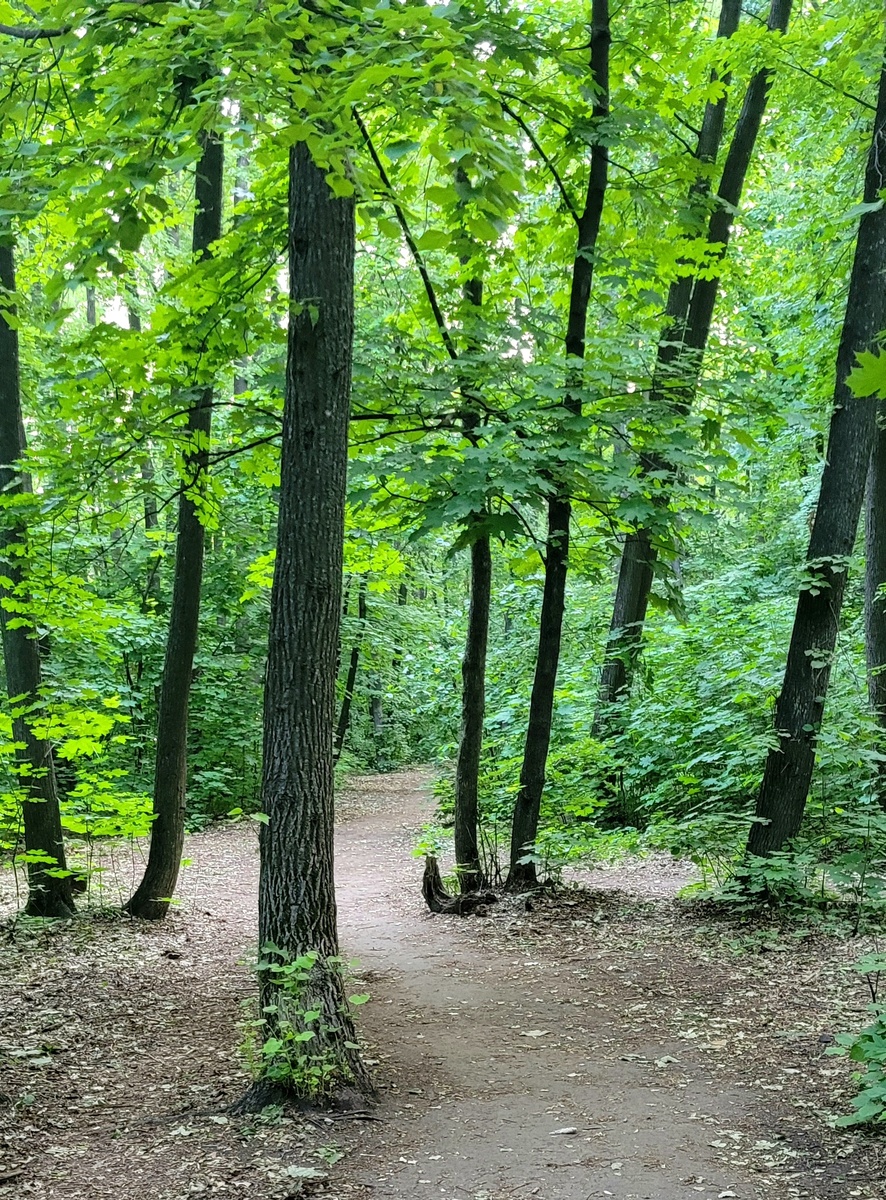 Здравствуйте, дорогие друзья и гости канала. Наконец-то я смогла возобновить ходьбу. После того как активно поработала на томатных грядках с наклонами и приседаниями, моей спине стало легче. Но до сих пор со страхом просыпаюсь по утрам. А вчера проснулась, стала поворачиваться на бок - не болит. Легко села на кровать. И даже встала с кровати без боли. И я решила, что пора мне возобновить ходьбу. Я даже забыла выпить стакан воды с медом. 6 часов утра. В это время сейчас на пробежках только молодежь. Мои друзья выходят позднее. В лесу немного темновато. Но я не боюсь так рано ходить. Мне птицы поют свои песни. Громко и на разные голоса. У них свои хлопоты. В лесу прохладно. Хорошие, ровные дорожки. До конца своего маршрута не увидела брошенного мусора. Люди привыкли убирать за собой. Здесь очень много новостроек и этот парк , единственное место, где можно провести время с детьми. Днем здесь толпы людей. Идешь по таким дорожкам и настроение поднимается. Прошла семейная пара. Примерно м