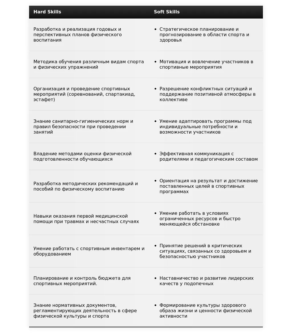 Педагогические навыки: Разработка учебных программ по физической культуре (эксперт), применение современных методик обучения (продвинутый), организация спортивных мероприятий для школьников (эксперт), работа с детьми разных возрастов (продвинутый). Организационные навыки: Планирование и организация спортивных мероприятий (эксперт), управление командой (средний), ведение документации (средний). Спортивные навыки: Знание правил различных видов спорта (продвинутый), оказание первой медицинской помощи (базовый).