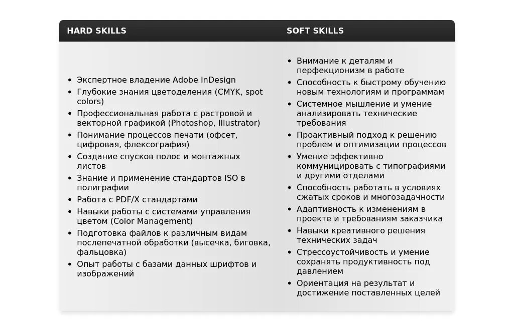 Внимательно изучите описание вакансии и выделите все ключевые слова, относящиеся к навыкам и компетенциям. Используйте эти ключевые слова в разделе "Навыки", чтобы показать, что вы соответствуете требованиям работодателя. Например, если компания ищет специалиста со знанием "цветоделения", то в навыках обязательно укажите "цветоделение".