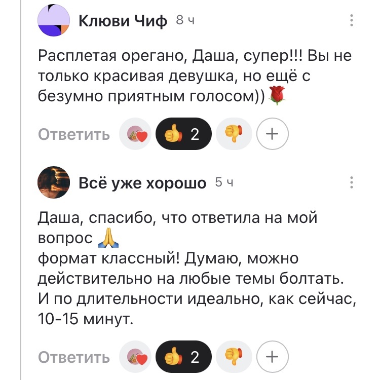 Это как голосовое сообщение от подруги, или же виртуальная прогулка, где мы разговариваем о всяком разном (точнее, говорю только я, но обращаюсь я именно к вам, моим подписчикам - представляя, что вы тут рядом, и так же я отвечаю на ваши вопросы в этом «подкасте»).