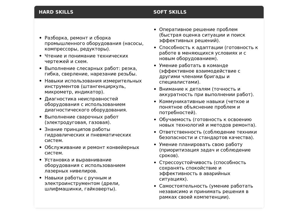 Рекомендации: В резюме необходимо *сделать акцент на опыте работы с насосным оборудованием* и знаниях в области гидравлики и пневматики. Опыт работы с агрессивными средами является ключевым требованием. Также стоит упомянуть о знании правил промышленной безопасности.