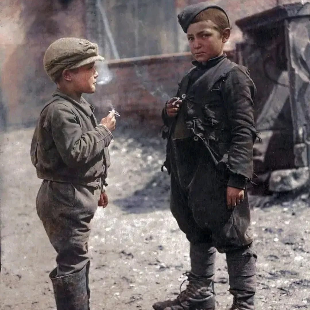 Фотография детей, сделанная рядом с немецким лагерем для военнопленных в Дучи (Douchy), Франция, примерно в 1916 году. На оригинальной стеклянной пластине подпись: «Луи». В книге «В стальных грозах», фронтовых мемуарах немецкого солдата-философа Эрнста Юнгера, упоминается пара мальчиков, очень похожих на этих. «Были два французских мальчика, сироты, одному восемь, другому двенадцать лет, которые самым необычным образом привязались к войскам. Они носили только серую форму, свободно говорили по-немецки и отдавали честь всем офицерам, как положено. О своих соотечественниках они отзывались с презрением и называли их "шангелями", как слышали от солдат. Их заветным желанием было пойти на передовую со своей ротой. Они хорошо владели строевой подготовкой и становились слева от роты на перекличке, а когда хотели сопровождать интендантов в поездке за провизией в Камбре, то официально просили разрешения. Когда 2-й батальон отправился в Кеан на несколько недель обучения, одного из них, по имени
