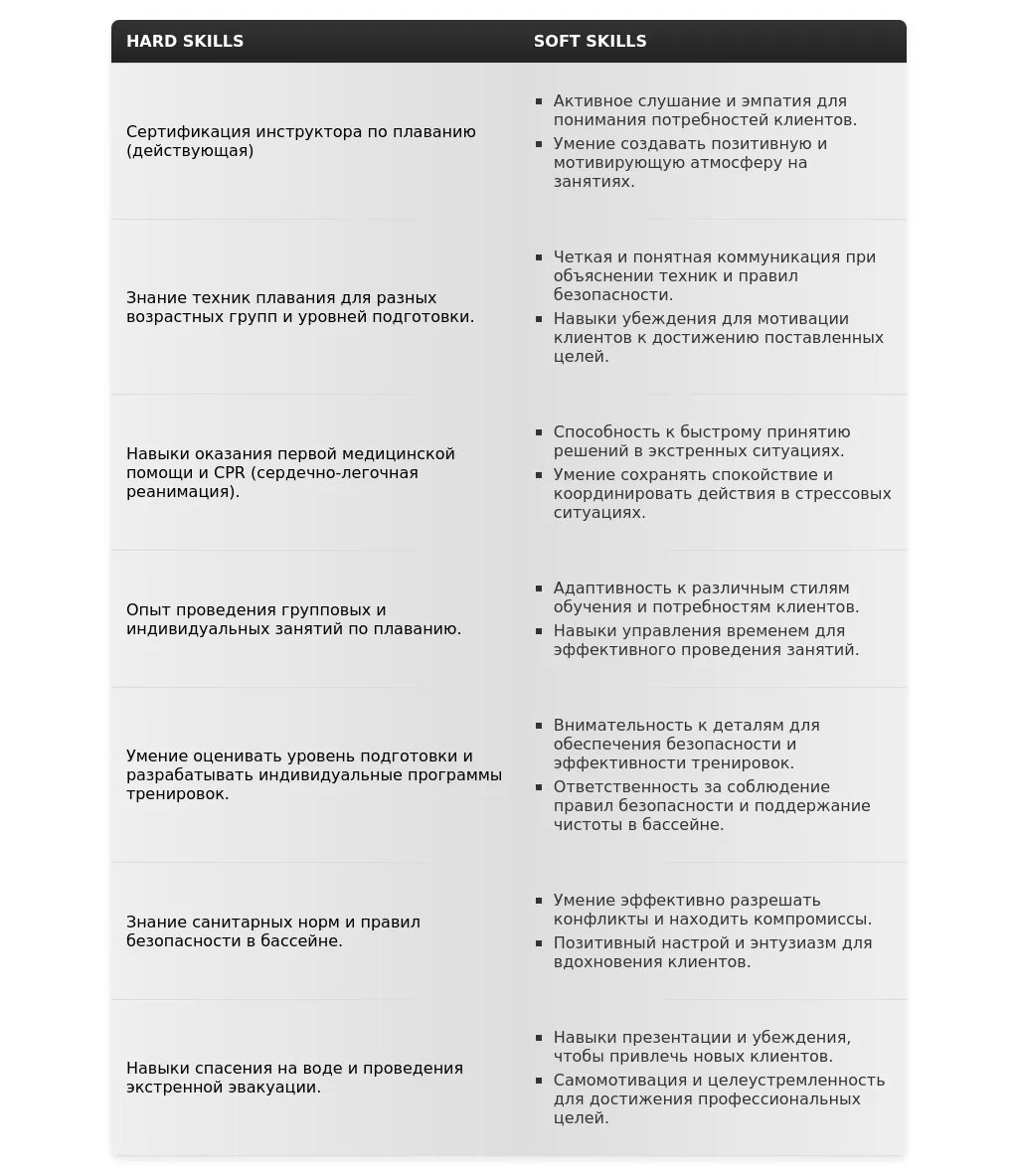 - Ошибка 2: Перечисление навыков без указания на их применение."Знаю различные стили плавания, умею оказывать первую помощь.""Владею техниками плавания кролем, брассом, баттерфляем и на спине. Имею сертификат оказания первой помощи и успешно применял эти навыки в экстренных ситуациях, обеспечивая безопасность посетителей бассейна."