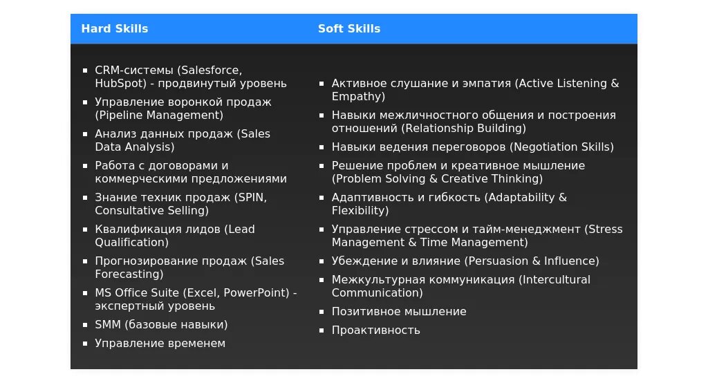 Раздел "Навыки" должен отражать ваши ключевые компетенции и соответствовать требованиям вакансии.