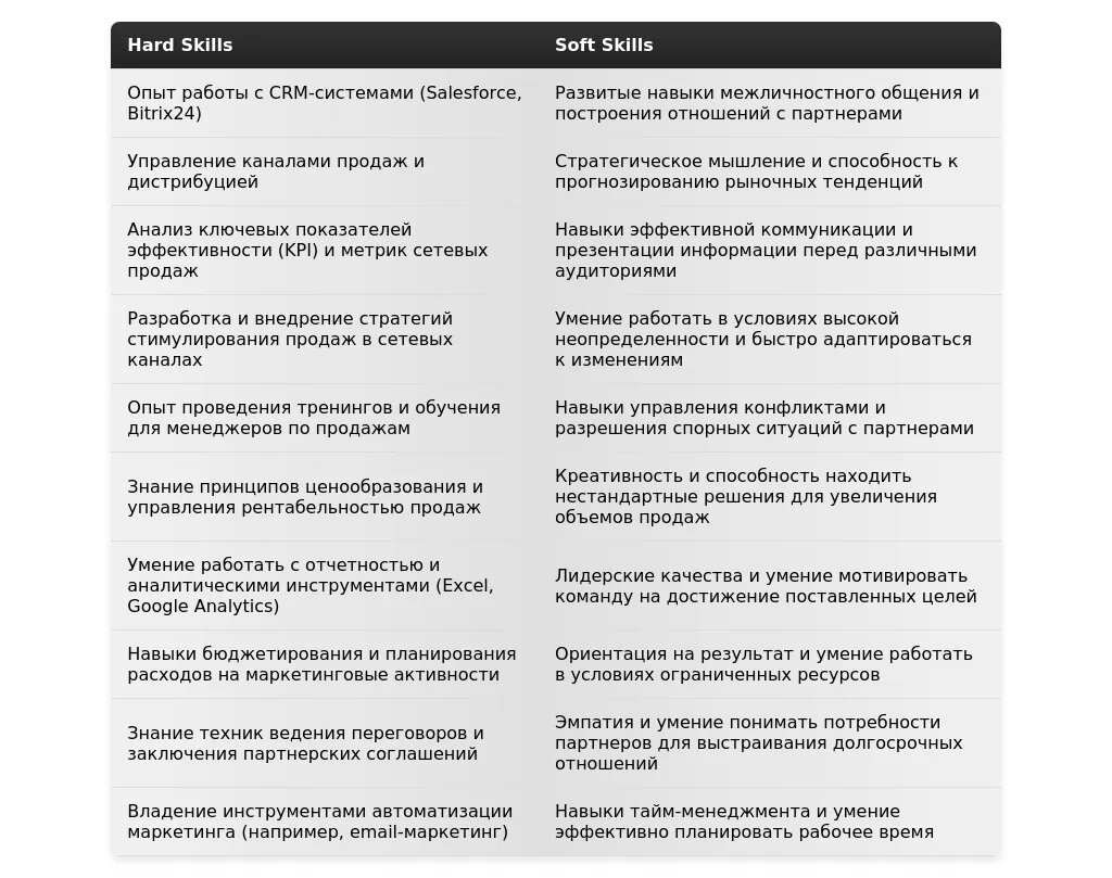 - Для вакансий в региональных компаниях: "Знание регионального рынка", "Работа с дистрибьюторами", "Развитие партнерской сети", "Управление продажами в регионе".