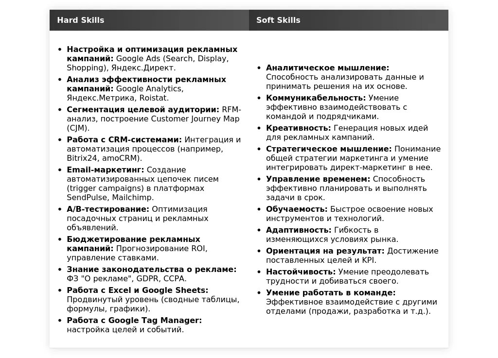 - На какие качества и навыки делать акцент: Аналитические способности, креативность, коммуникабельность, знание основ маркетинга и рекламы, владение инструментами аналитики (например, Google Analytics, Яндекс.Метрика).