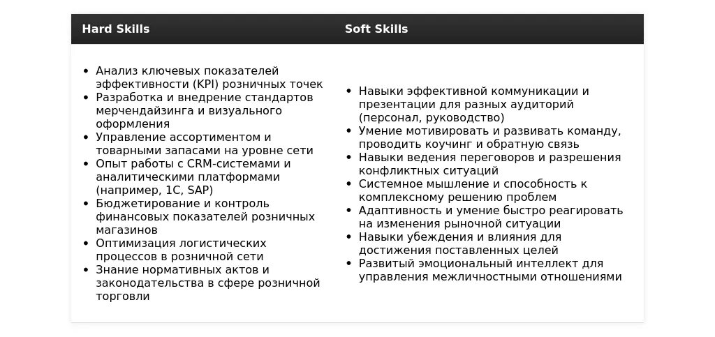 Чтобы заголовок был максимально эффективным, укажите свою специализацию. Это может быть конкретный тип розничной сети (например, продуктовая, fashion, бытовая техника) или регион, за который вы отвечали. Добавление специализации сделает ваше резюме более релевантным для конкретных вакансий.