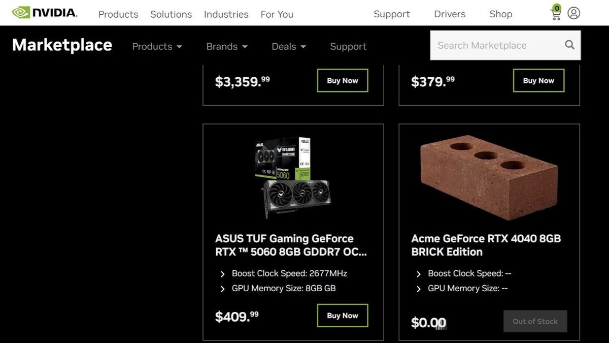 Nvidia начала торговать кирпичами (почти) На площадке Nvidia Marketplace, где собраны предложения от различных продавцов, появился необычный лот — GeForce RTX 4040 BRICK Edition. Новинка оснащена 8 ГБ видеопамяти, при этом неясно, куда она вмонтирована — под этим названием предлагается не видеокарта, а обыкновенный кирпич с тремя отверстиями для вентиляции. Поддерживает ли RTX 4040 новейшие технологии вроде DLSS 4, выяснить не удастся — все кирпичи уже раскуплены (если они были). 💼 Rozetked | Подписаться
