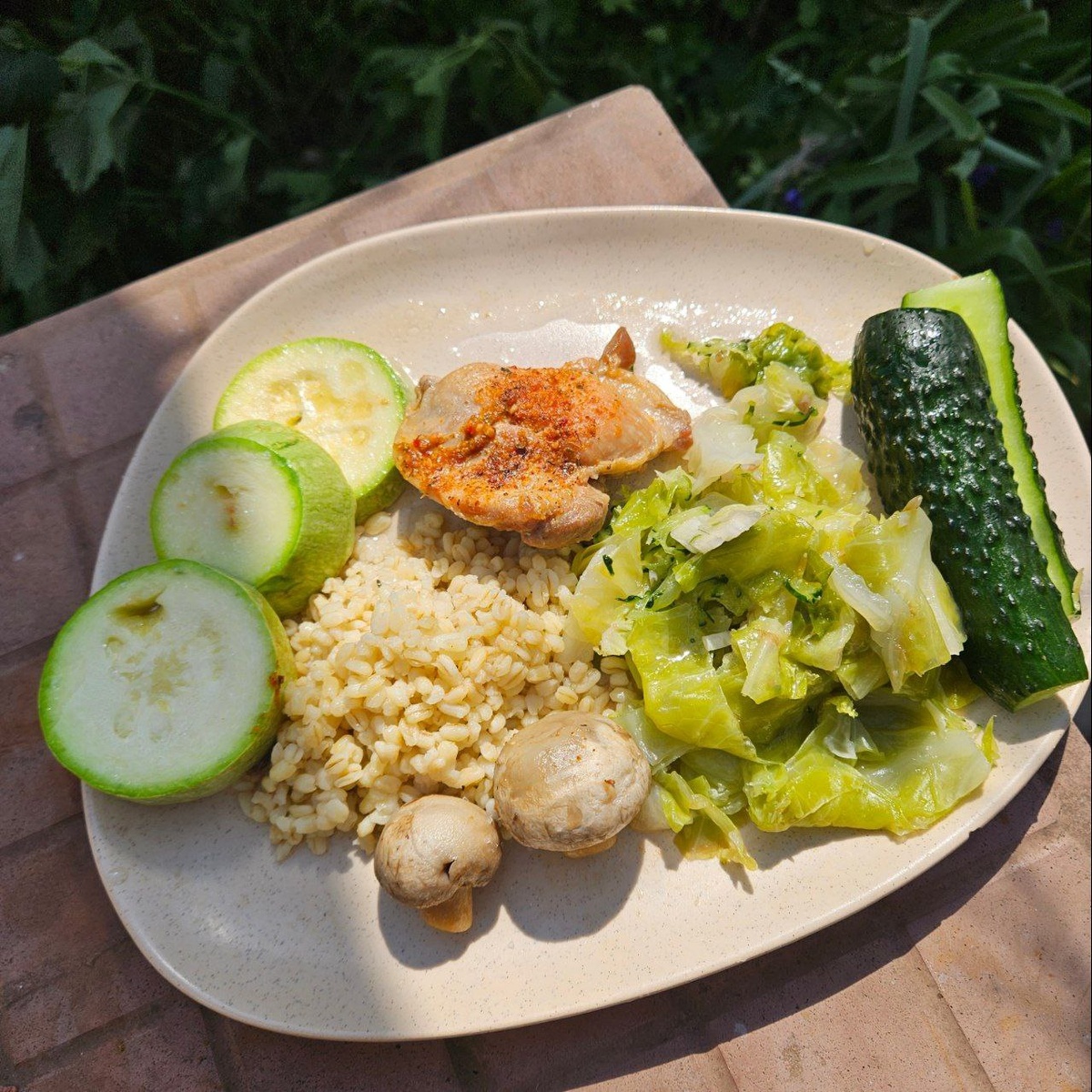 Хочу понравиться своему глюкометру🤗 Напоминаю, что на таком вот питании он мне выдаёт содержание сахара 5,4, а когда я вчера наелась мёда с булкой, то утррм натощак показал почти 7 А ещё до этого, когда я ела всё подряд было ещё больше. И 10 и 11🙄 Вот эти цифры меня и сподвигли создавать себн ,,правильную,, тарелку, а именно: 50% овощи 25 % медленные углеводы 25% белок Медленные углеводы в данном случае-это булгур Белок -курица и грибы Овощи -капуста и кабачок с огурцом Потом я ещё добавила тыквенный урбеч, чайную ложку Проверим, как среагирует мой организм