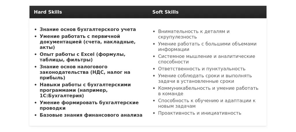 - На какие качества и навыки делать акцент: Внимательность, аккуратность, аналитические способности, знание Excel, основы бухгалтерского учета.