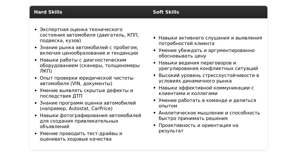 Анализ: Важен опыт работы на рынке автомобилей с пробегом, умение проводить оценку на месте (диагностика, выявление дефектов). Обязательно наличие личного автомобиля и готовность к разъездам.