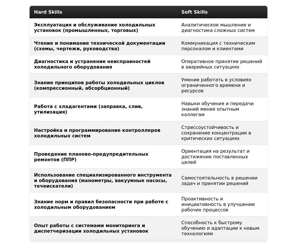 - На какие качества и навыки делать акцент:Знание основ холодильной техники и термодинамики.