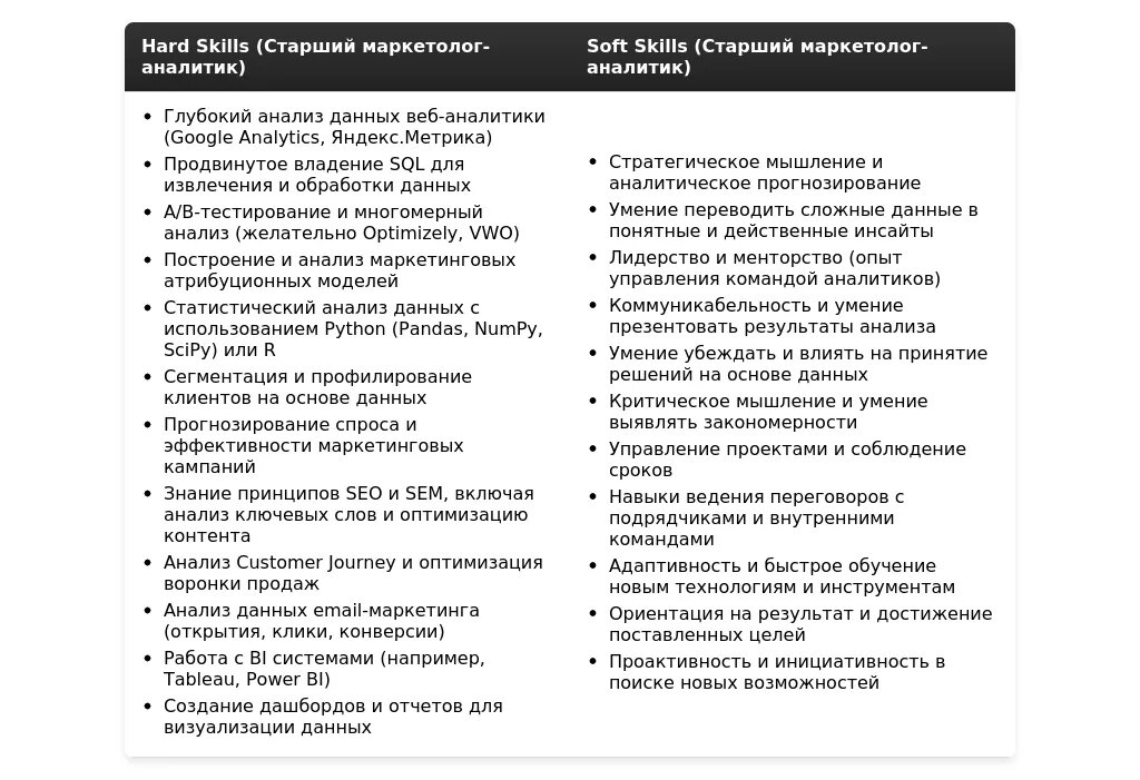Ключевые навыки и компетенции, релевантные для позиции старшего маркетолога-аналитика.