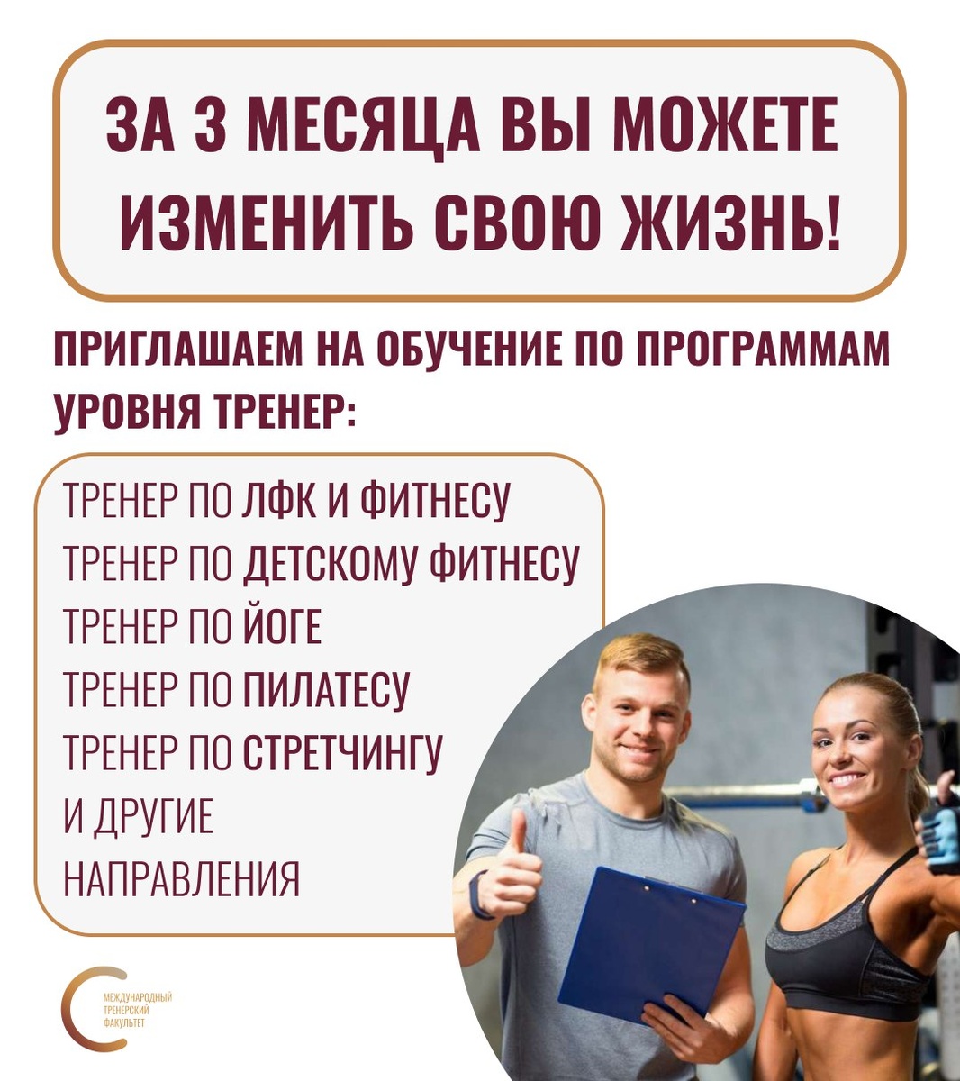 🔥 ИЗМЕНИ СВОЮ ЖИЗНЬ ЗА 3 МЕСЯЦА! 🔥 Лето — идеальное время для старта новой карьеры! 🚀 У нас более 15 программ обучения, которые помогут Вам стать профессиональным тренером всего за 3 месяца. После окончания вы получите диплом и сможете сразу начать работать! Направления: ✅ Тренер по ЛФК и фитнесу ✅ Тренер по детскому фитнесу ✅ Тренер по йоге ✅ Тренер по пилатесу ✅ Тренер по стретчингу ✅ И многие другие! 📌 Записывайтесь сейчас и начните менять свою жизнь уже этим летом!