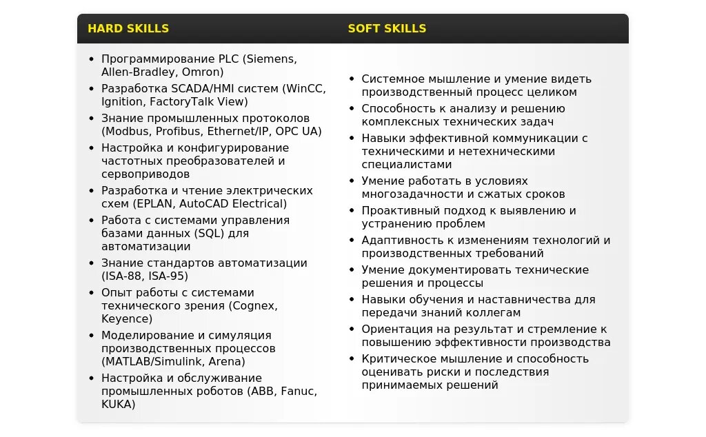 Навыки: PLC, SCADA, C++, Python, английский язык.