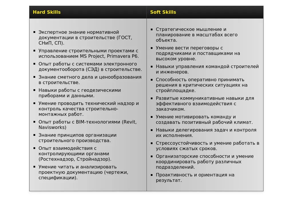 - На какие качества и навыки делать акцент:Знание строительных норм и правил (СНиП, ГОСТ).