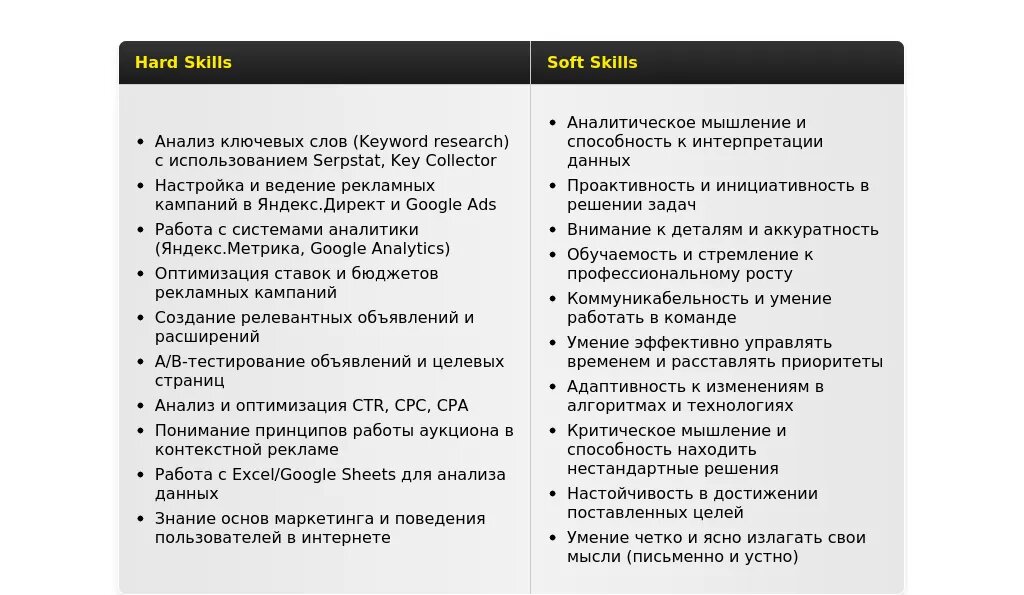 Ключевые навыки и знания, релевантные контекстной рекламе.
