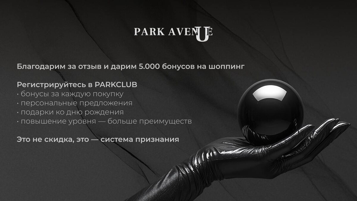 💬 Именно ваше слово помогает нам расти — честно, точно, в правильном ритме ⏺ С благодарностью за доверие к нашему бренду Дарим 5000 бонусов на шопинг в PARK AVENUE за отзыв на Яндекс Картах ⏺ Если вы ещё не стали частью PARKCLUB — пространства для ценителей авангардной моды — самое время присоединиться Теперь вас ждут не только качественные вещи и стильные образы, но и щедрые бонусы, персональные предложения и множество других преимуществ. Обыкновенно все, кроме вас!