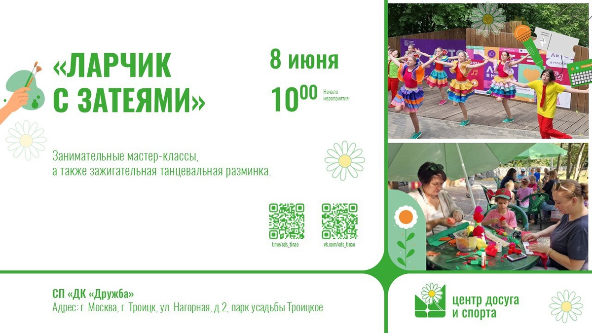 Приглашаем всех на мероприятие «Ларчик с затеями», которое состоится 8 июня в 10:00 в рамках проекта "Лето в Москве" Вас ждут занимательные мастер-классы и зажигательная танцевальная разминка! Адрес проведения: г. Москва, г. Троицк, ул. Нагорная, д. 2, парк усадьбы Троицкое. Ждём вас на творческом и весёлом празднике!