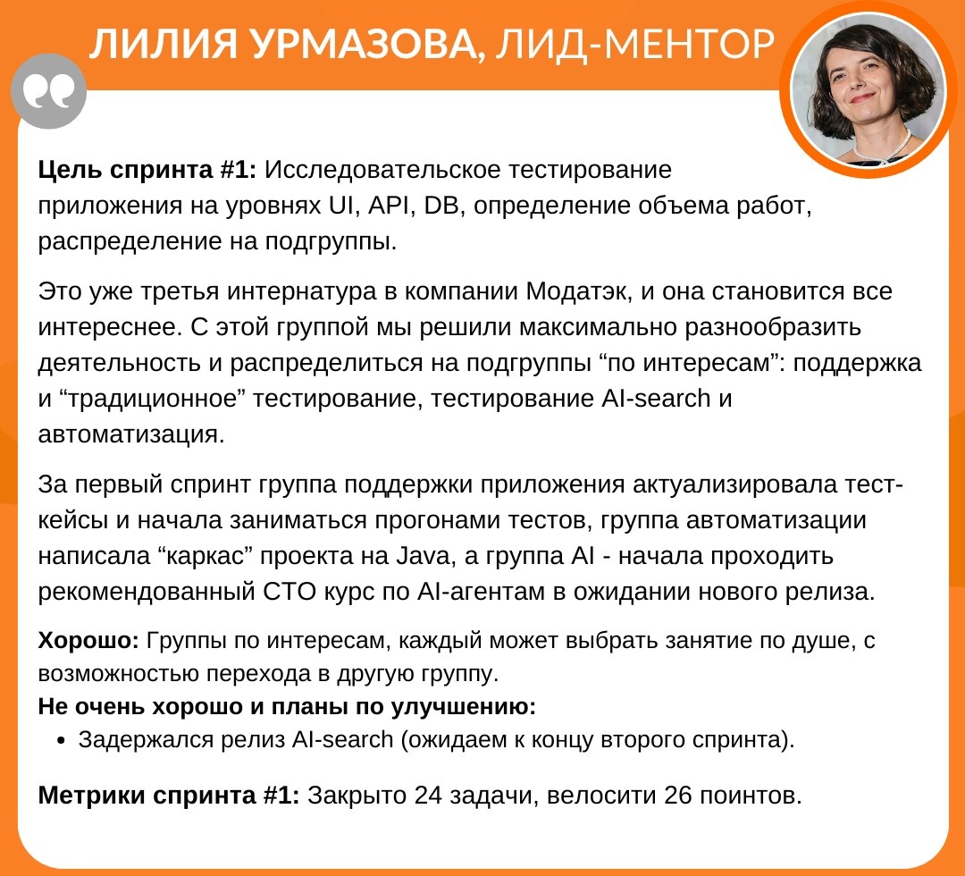 Лилия Урмазова, лид-ментор: "Это уже третья интернатура в "Модатэк", и она становится все более увлекательной. С этой группой мы решили максимально разнообразить деятельность, разделившись на подгруппы по интересам: поддержка и 'традиционное' тестирование, тестирование AI и автоматизация."
