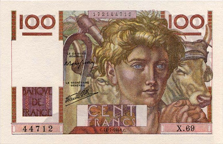 После Второй мировой войны стоимость французского франка продолжала падать, пока в 1959 году она не стала менее 1/40 от своей стоимости 1935 года.