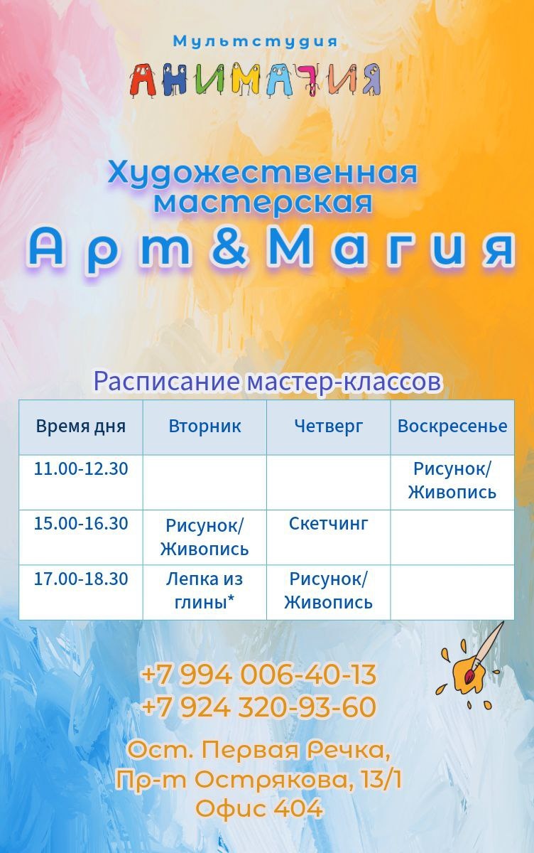 А вот и расписание художественных занятий в нашей мастерской "Арт&Магия". Найдите удобное для вас время. Отведите душу! Разбудите в себе автора!!!