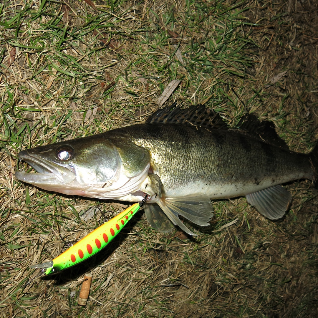 Ловля судака на воблеры ночью — занятие азартное и добычливое. Лучшее время ловли — с 10 вечера до полуночи. Поймать этого хищника можно на небольших медленных реках и на их проточных старицах с песчаным дном и глубиной 1-2 метра. Также судак часто выходит поохотиться на мелководья водохранилищ и песчаные плёсы крупных рек. Особенно интересно ловить его в городской черте — например, в Минске на Свислочи или в Гродно на Нёмане. Городская подсветка добавляет комфорта — не нужно светить фонарём и лишний раз пугать рыбу. Одним из рабочих воблеров на судака можно назвать Lucky John Makora 110 SP. Эта модель обладает низкочастотной игрой с небольшой амплитудой колебаний. Расцветки работают яркие — 201 или 301. Можно пробовать оливковый цвет 302 со светящимися в темноте жёлтыми точками. Хорошо себя зарекомендовала окраска 104 — зеленоватые с голубыми пятнами бока, чёрная спина и оранжевое брюшко. Лучше всего судак реагирует на воблеры типа «минноу», но это могут быть и удлинённые «шэды» напод