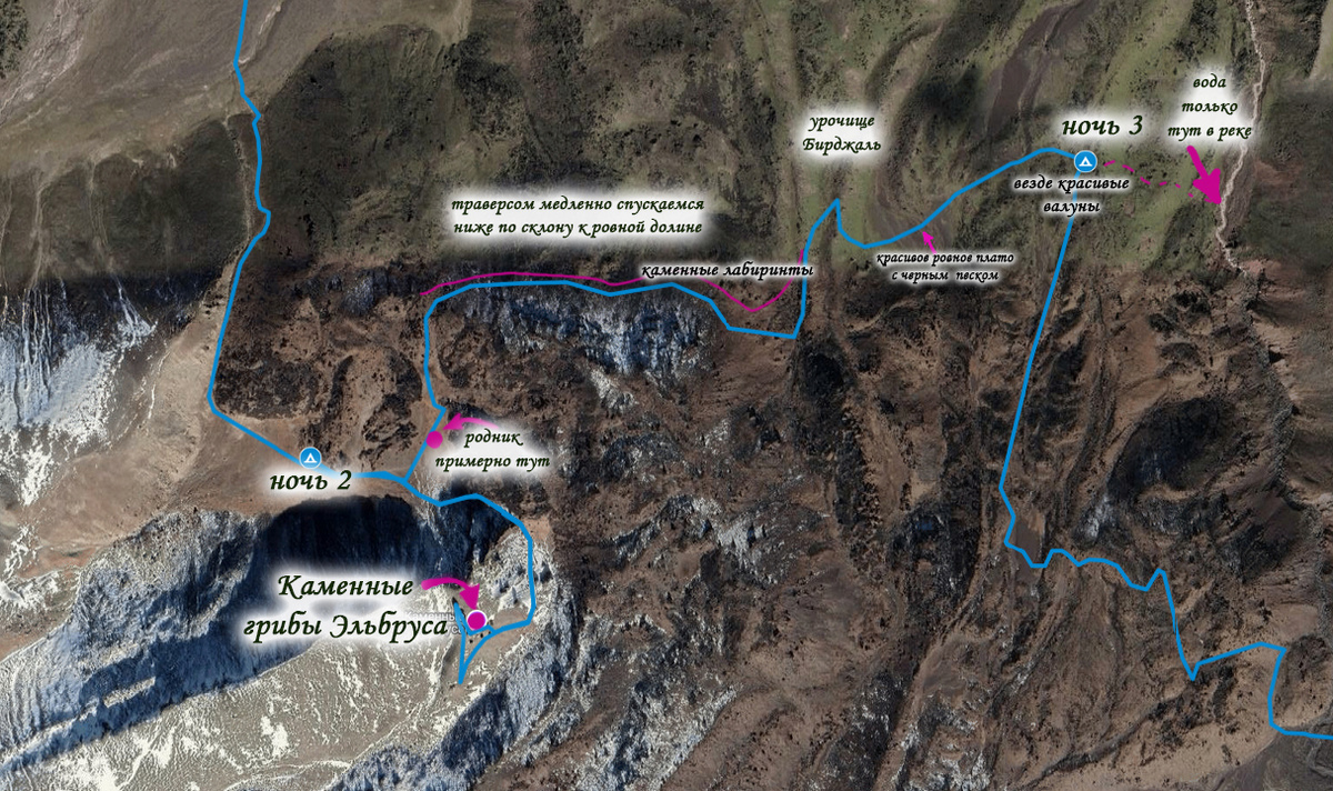 Планы на сегодня: радиальный выход налегке к каменным грибам Эльбруса через "малую поляну под грибами", полюбоваться грибами и Эльбрусом, вернуться к большой поляне за рюкзаками, а далее идти без тропы по направлению на восток, спуститься к урочищу Бирджаль и дойти до берега реки Бирджалы Су и дальше вверх по течению, насколько успеем. В общем разведка местности в попытке соединить два линейных маршрута.