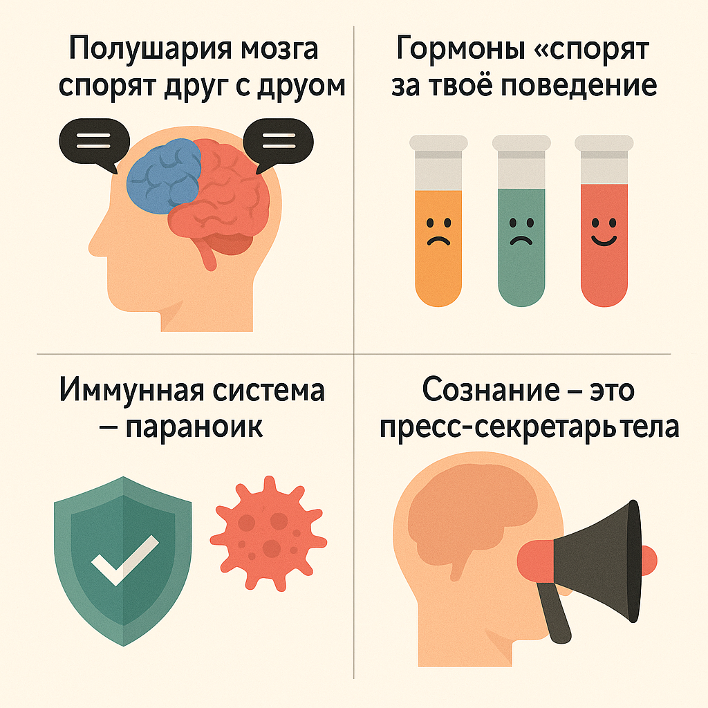 Да-да, прямо сейчас в твоём теле идёт… внутренняя война. И ты даже не подозреваешь об этом. 🧠 1. Полушария мозга спорят друг с другом Правое и левое полушарие по-разному воспринимают мир. Одно — логик, другое — художник. Они буквально соревнуются за контроль над твоим вниманием. Отсюда — внутренние противоречия, странные сны и необъяснимые поступки. 🧪 2. Гормоны «спорят» за твоё поведение 💬 3. Иммунная система — параноик Она атакует всё, что не узнаёт: бактерии, вирусы, иногда — собственные клетки. Аутоиммунные болезни — результат того, как твоя система безопасности перестаёт различать «своих» и «чужих». 🧫 4. Гены — как политика в семье Ты получил гены и от матери, и от отца, но не все они согласны друг с другом. Некоторые буквально конкурируют — это называется генетическим конфликтом. Некоторые гены стараются «протолкнуть» ресурсы плода, другие — «экономят». Ты — результат этого компромисса. 🧍 5. Сознание — это пресс-секретарь тела Ты не при