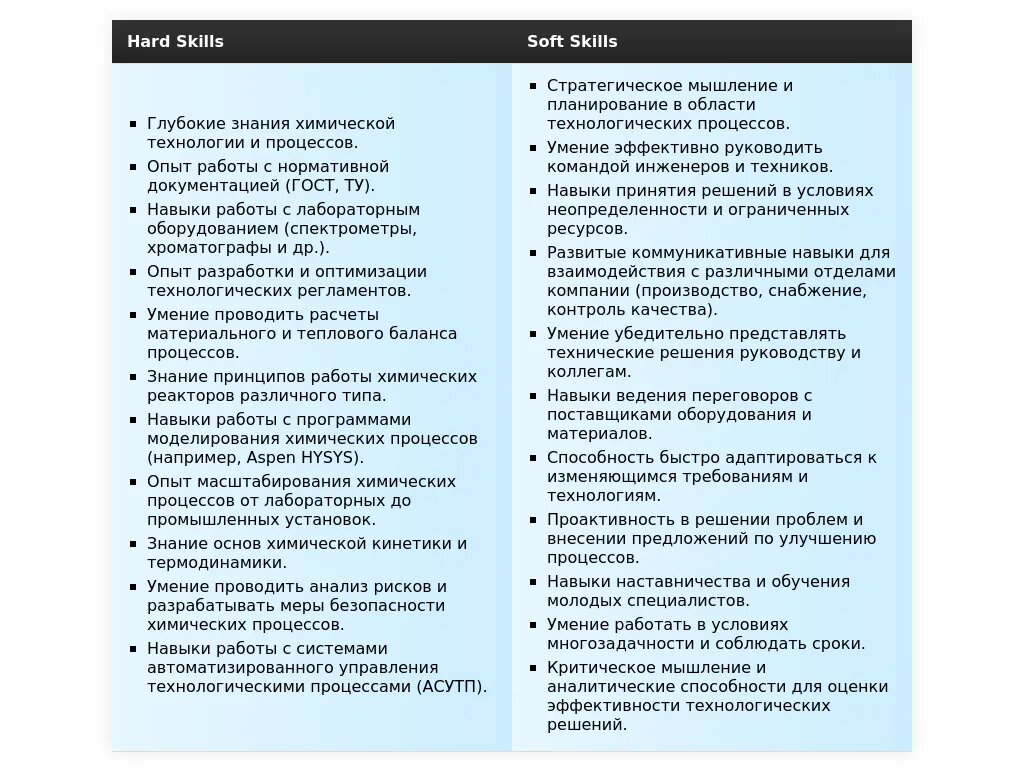 - Сгруппируйте навыки по категориям: Например, "химический анализ", "технологические процессы", "охрана окружающей среды", "программное обеспечение".