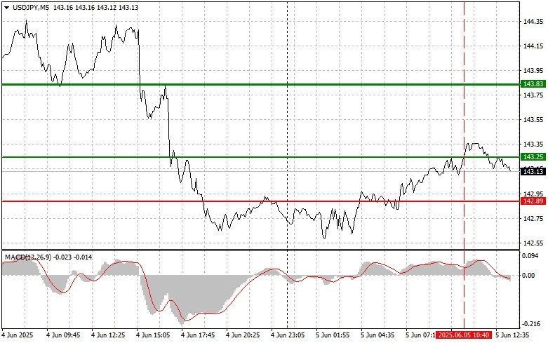Тест цены 143.25 в первой половине дня пришелся на момент, когда индикатор MACD много прошел вверх от нулевой отметки, что ограничивало восходящий потенциал пары.