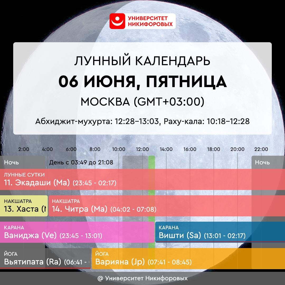 6 ИЮНЯ, ПЯТНИЦА До 7:41 энергия все еще сложная, не сопутствующая важному и новому. Утро стоит начинать максимально плавно и бережно по отношению к себе и другим. С 7:41 до 10:48 идет наиболее благоприятный промежуток этого дня, когда можно относительно плодотворно поработать. Сегодня может быть меньше сил – и физически, и ментально, больше напряжения и недопониманий. Можно поддержать себя, осознанно приняв на этот день аскезу по питанию. Тем более сегодня Экадаши – время для традиционного поста и разгрузки. В этот день Марс переходит в знак Льва и пробудет там до 28 июля. Это положение усиливает планету: появится больше энергии, добавится сил для разных дел и активностей, станет легче достигать поставленных целей. Одновременно может повыситься общий уровень конфликтности, готовности отстаивать свою позицию. Агрессии станет больше, возрастает риск пожаров и травм. Также сегодня Меркурий переходит в знак Близнецов и пробудет там до 22 июня. Это хорошее положение для Меркурия, его со