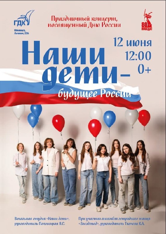 🎶12 июня в 12:00 в Городском Дворце культуры в Обнинске пройдёт концерт, посвящённый Дню России. 🇷🇺12 июня День России — праздник свободы, национального единения и общей ответственности за настоящее и будущее нашей Родины! Наши дети - будущее любой страны, поэтому 12 июня поздравлять город с праздником будут те, кто в будущем продолжат великий путь нашей страны - путь мира и добра. В концерт войдут песни разных стилей и эпох. Наряду с советскими песнями, которые являются культурным наследием России, прозвучат композиции современных детских авторов, а также авторский материал. Приглашаем вас на концерт, чтобы вместе отпраздновать день России. Ведь вместе мы едины! Вместе мы непобедимы! Вход свободный. Обнинск, пр-т Ленина, 126. 👍 Подписаться | Прислать мероприятие
