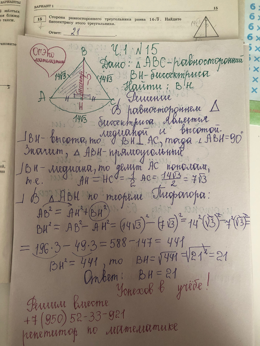 ОГЭ по математике: найти биссектрису в равностороннем треугольнике (часть 1 номер 15)