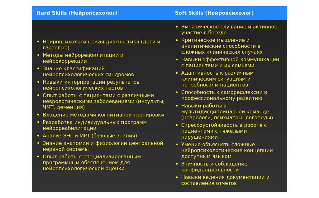 - Акцент на качествах и навыках: Внимательность, эмпатия, аналитические способности, умение работать в команде, знание методик нейропсихологической диагностики.