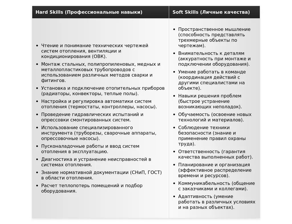 - Описывайте свой опыт работы с различными материалами и оборудованием: Укажите, с какими трубами, фитингами, радиаторами и другим оборудованием вы работали.