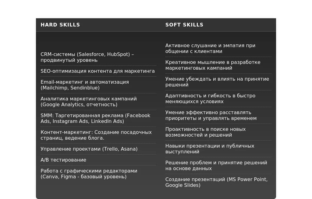- Выделите основные группы навыков: Например, "Маркетинг", "Продажи", "Аналитика", "Коммуникации".