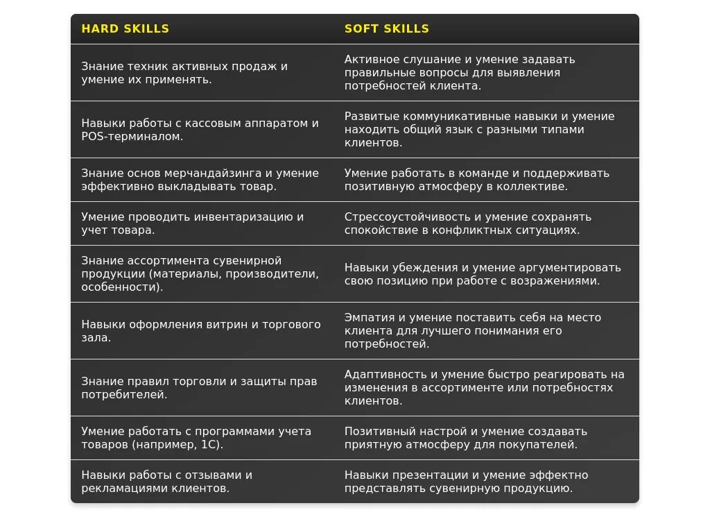 Раздел "Навыки" – это ваша возможность продемонстрировать работодателю, что вы обладаете всеми необходимыми компетенциями для успешной работы в должности продавца сувенирной продукции. Важно адаптировать этот раздел под конкретные требования вакансии, чтобы показать, что вы являетесь идеальным кандидатом.