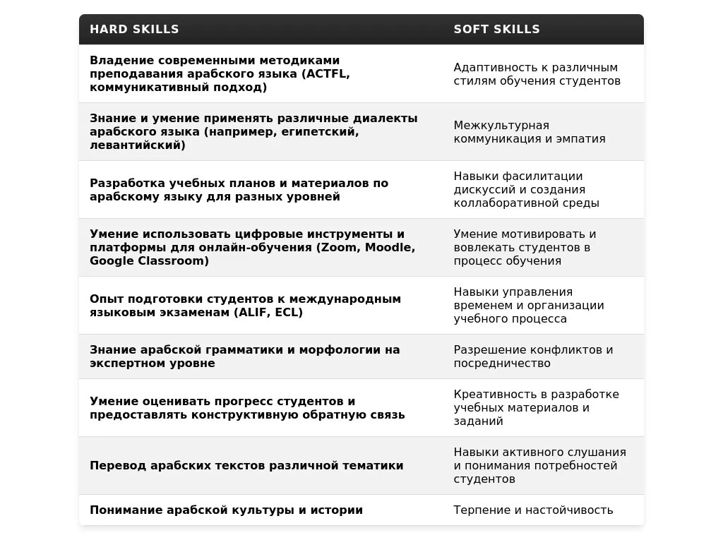 - Для вакансий преподавателя арабского языка для взрослых: "развитие навыков делового общения", "подготовка к переговорам и презентациям", "изучение специализированной лексики", "совершенствование грамматики и стилистики".
