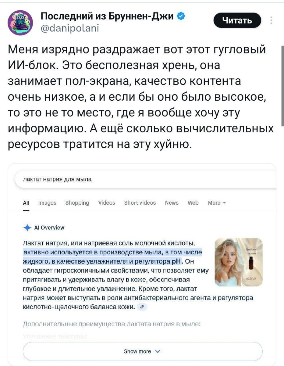 Анекдот: если добавить в гугловский запрос матерное слово, то раздражающий ИИ-блок в результатах поиска ИСЧЕЗНЕТ!