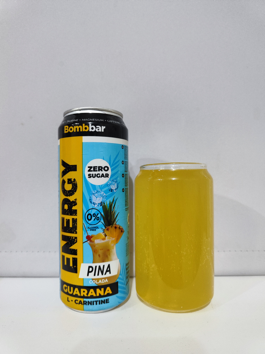 Обзор на Bombbar "Pina Colada" Последняя "алкогольная" новинка от бомббар и самая неинтересная из 3. Голубой фон, бокал с пина коладой, кринжовый PNG лёд, куча текста, всё в лучших традициях этого бренда. На фоне изображены листья, не совсем понятно пальмовые ли они, ведь не похожи, да и зачем неясно, видимо не придумали че пихнуть и на шару закинули. Пахнет ярким, но невероятно химозно противным коктейлем пина колада, с ярким ананасом. Вкус похож на заявленный коктейль, не считая жжения. Ощущается и ананас и кокос, а также нежнейшая сливочность, но вкус очень тусклый и быстро пропадает, а ещё, в отличии от джин тоника, здесь сахзам довольно сильный, сопровождает напиток всё время, а в завершении совсем проявляет личину и размыливается. Напиток вышел хоть и очень слабым в спектре вкуса, зато таким каким нужно. И конечно же общий вид испортил сахарозаменитель, который здесь имеет явно не последнее слово, так что употребить нормально не выйдет. Вся линейка получилась довольно хороша, осо