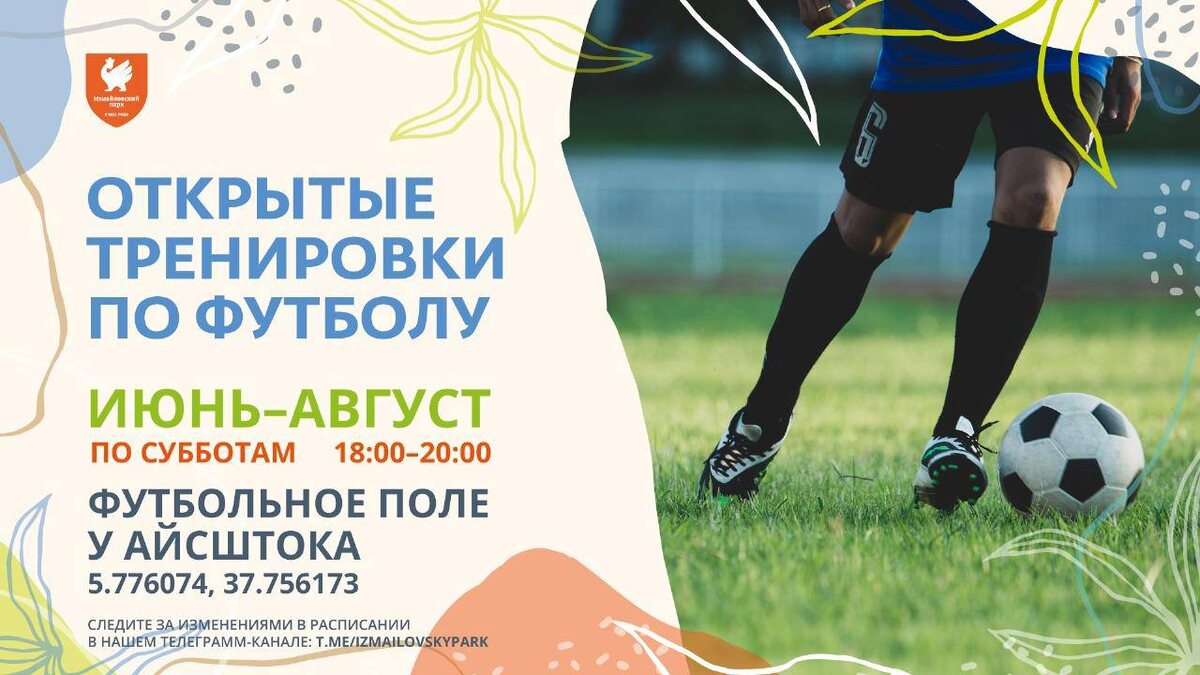 🆓Бесплатные тренировки по футболу от футбольной академия "Шанс" в Измайловском парке @izmailovskypark 🗓️по субботам 18:00 - 20:00 📍Измайловский парк, рядом с главным входом со стороны Московского проспекта Под руководством опытных наставников участники смогут обучится правилам игры, ведению мяча, стратегическому мышлению на футбольном поле, различным техникам и тактическим приемам в футболе. 4+ 🆓Бесплатно без регистрации Подробнее ЗДЕСЬ 👨👩👧👦 @Together_with_kids Пост носит информационный характер