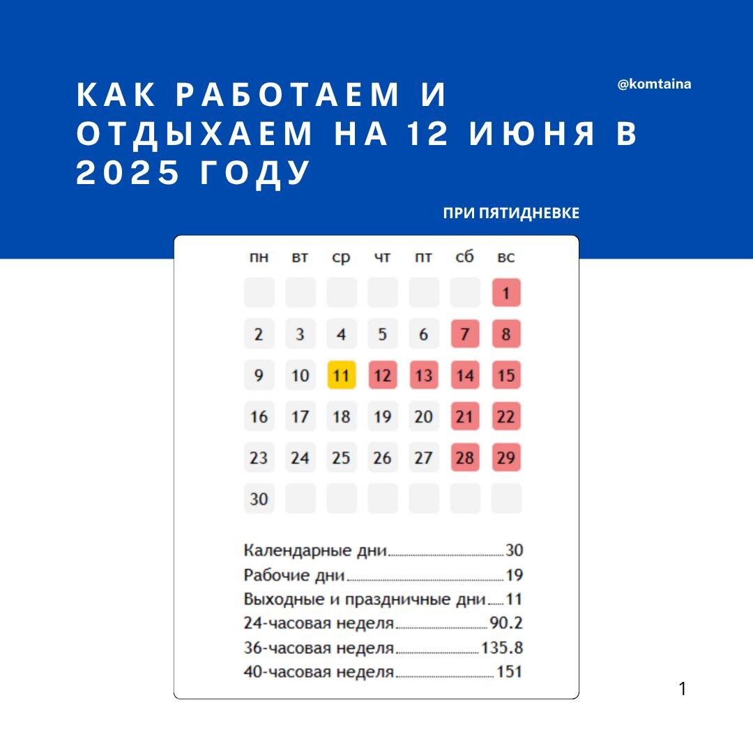 ⭐️ Как работаем и отдыхаем на 12 июня в 2025 году 12 июня — День России, официальный государственный праздник. В 2025 году он выпадает на четверг, и казалось бы, что тут особенного? А вот что: из-за переноса выходного с субботы 8 марта (которая была праздничной) на пятницу 13 июня — отдыхать будем четыре дня подряд: с 12 по 15 июня включительно. А 11 июня, в среду, — сокращённый рабочий день. 💡 А если у вас шестидневка? Тогда всё скромнее: дополнительный выходной — только 12 июня. Но среда, 11 июня, тоже будет сокращённой. 🔥 Так что, если вы работаете по стандартному графику — бронируйте отдых, планируйте загрузку и готовьтесь к длинным выходным уже сейчас. Делитесь жаркой новостью.) @komtaina