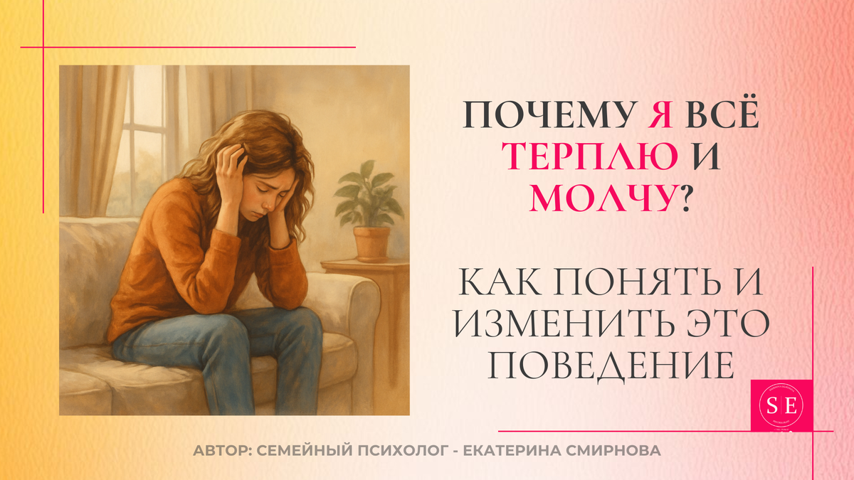 Автор: Екатерина Смирнова — семейный психолог, эмоционально-фокусированный терапевт. Опыт с 2017 года Вы когда-нибудь ловили себя на мысли: «Я снова промолчала. Снова проглотила. Снова сказала, что всё в порядке — хотя совсем не так…» Внутри — обида, усталость, раздражение. Но снаружи — «Я справляюсь». А потом, возможно, взрыв. Или болезнь. Или тишина на неделю. Почему мы терпим? Почему копим? Почему говорим «ничего» — когда там внутри всё? 1. Из семьи, где чувства были «неудобны»