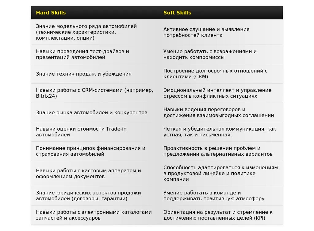 Адаптация раздела "Навыки" для консультанта по продажам автомобилей