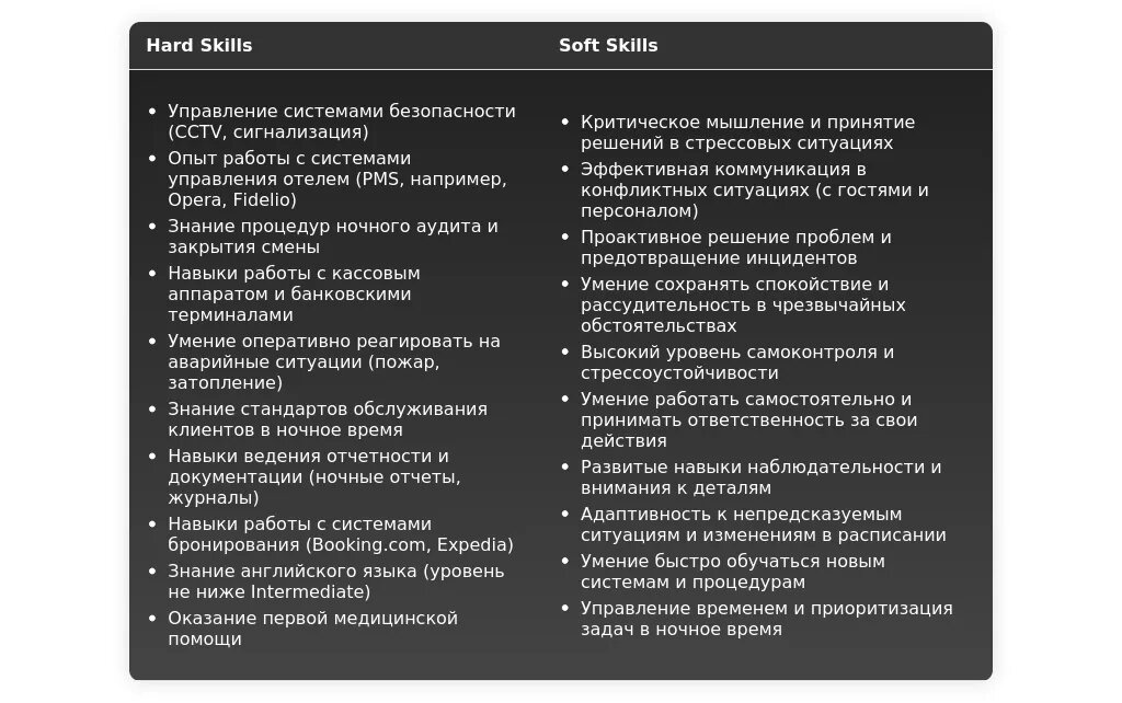 Раздел "Навыки" – это место, где вы можете продемонстрировать свои профессиональные и личные качества, которые необходимы для успешной работы Night Manager.
