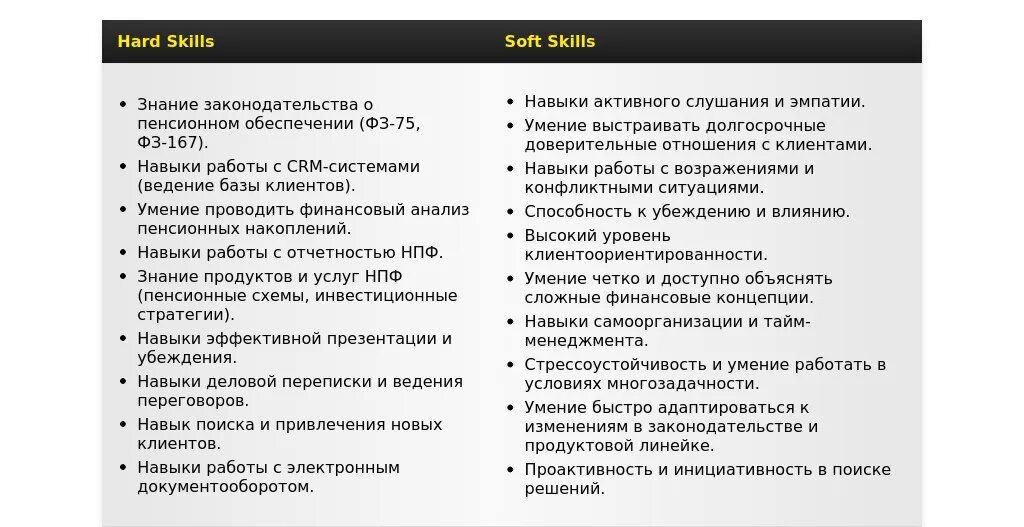 "***Навыки продаж, умение убеждать, ведение переговоров, консультирование клиентов, знание законодательства в сфере пенсионного обеспечения.***"