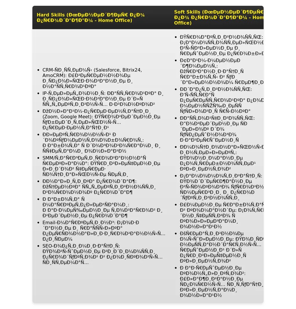 - Какую информацию обязательно включить:Ключевые навыки и компетенции, релевантные для позиции менеджера по продажам home office.