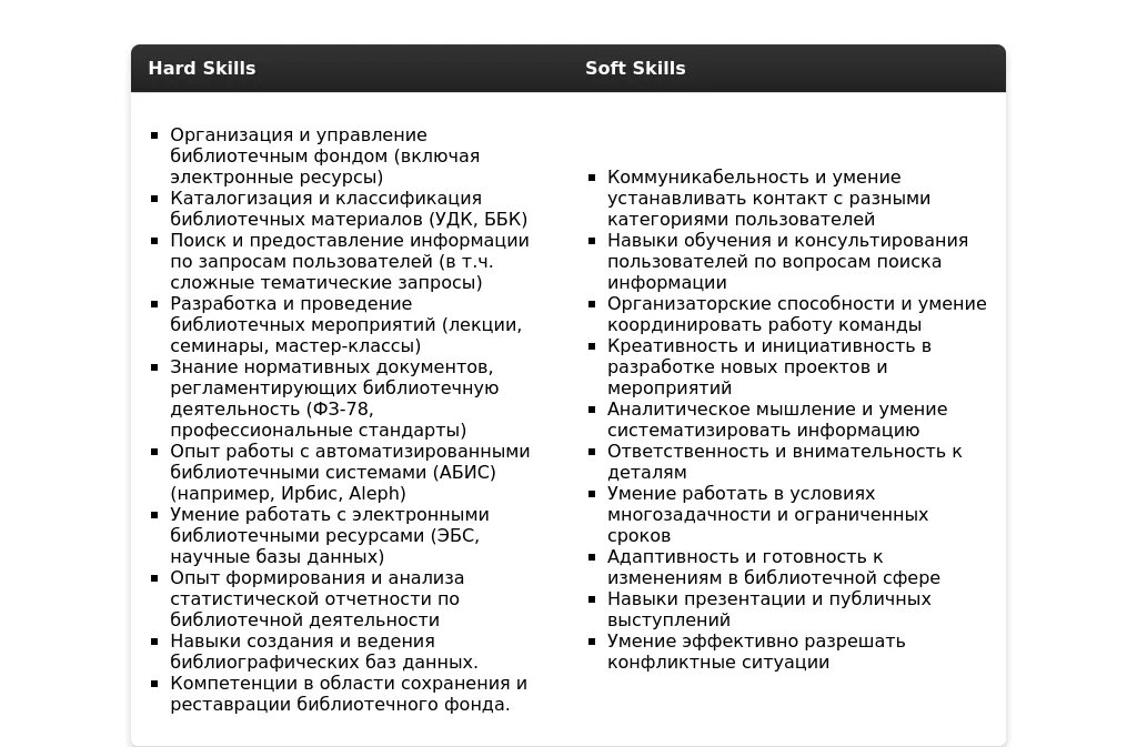 - Для вакансий в публичных библиотеках: "Работа с читателями", "Организация мероприятий", "Популяризация чтения", "Коммуникативные навыки", "Работа в команде".