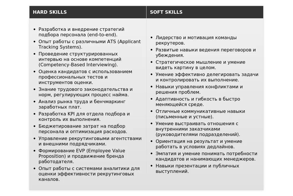 Soft Skills: Управление командой, Коммуникация, Ориентация на результат. Инструменты: *Хантфлоу*, *Talent.Rocks*, LinkedIn Recruiter."